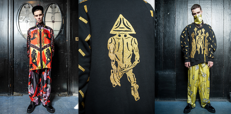 La colección está llena de bomber jackets, pantalones, shorts y camisas oversized, pero los verdaderos protagonistas son los colores, intensos y saturados. Rojo, amarillo, negro y dorado son los colores predominantes de esta colección, la cual ella misma describe como kitsch. Todas y cada una de sus prendas, están hechas de seda y texturas brillantes, adornando su styling con grandes cadenas doradas.