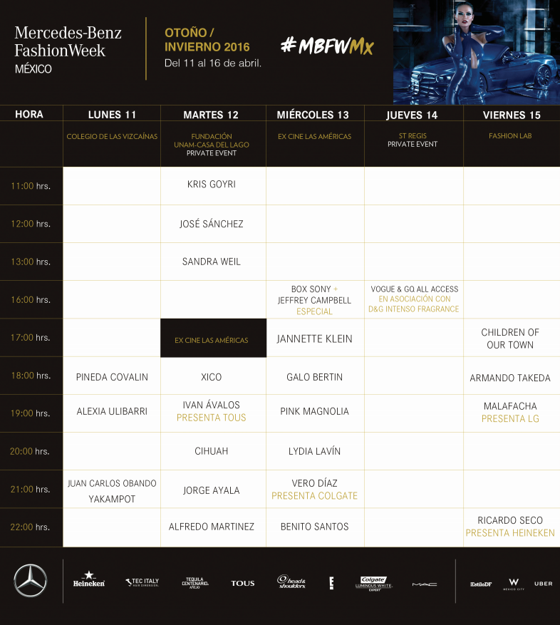 La decimonovena edición de #MBFWMx se llevará a cabo del 11 al 15 de abril de 2016, con 23 diseñadores mostrando sus colecciones otoño-invierno 2016 en seis locaciones icónicas de la Ciudad de México.